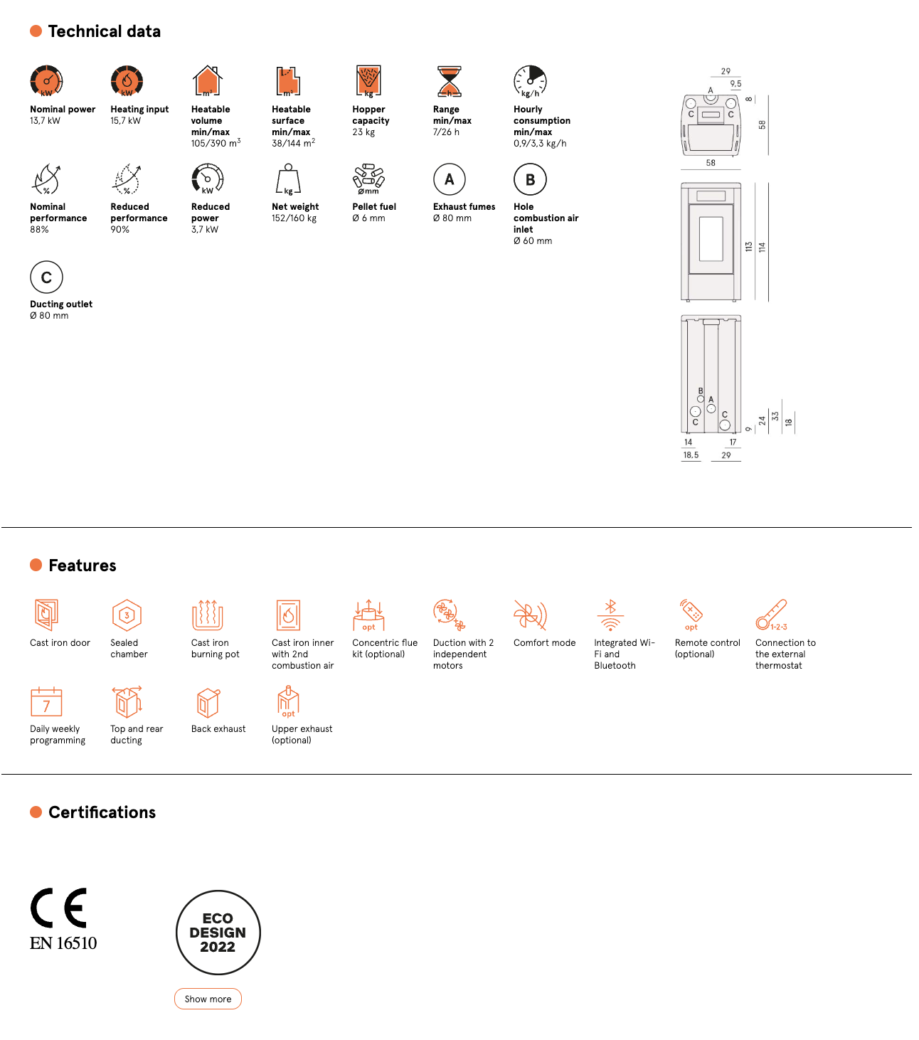 Soba pe peleti ATENA PLUS 14 (14kW), model canalizabil, WiFi & Bluetooth, clasa energetica A+